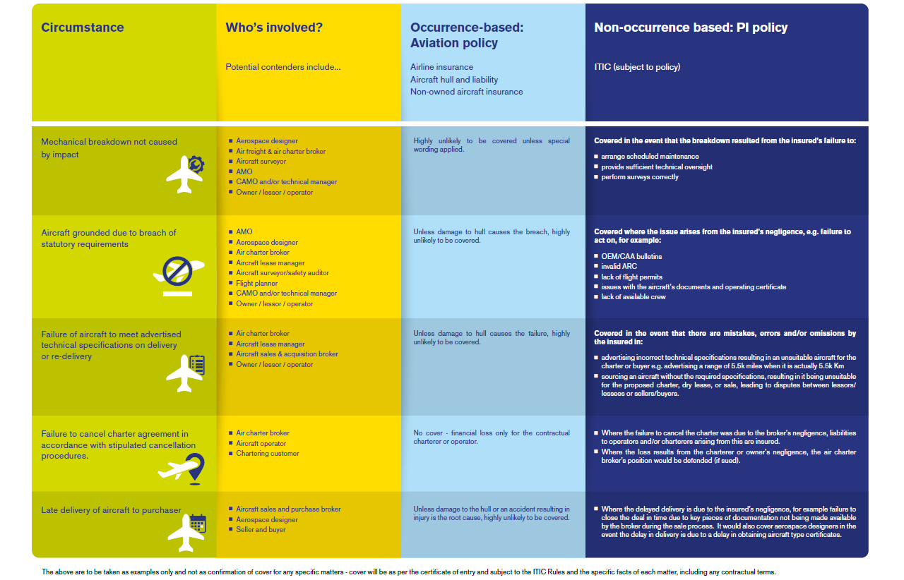 This table highlights one of the key attributes of ITIC’s PI cover for the aviation sector: its ability to dovetail with aviation cover and fill potential gaps in coverage.